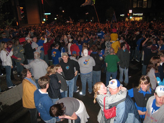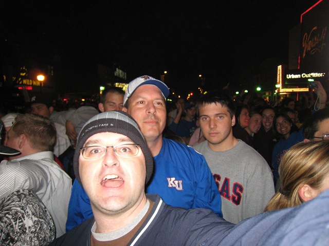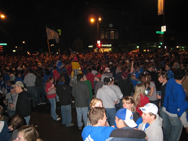 What a night! Mario Chalmers hits a last second three to send the game into overtime and KU rolls from there. Twenty years ago when KU won their last national championship I was at KU. I just had to head down to Lawrence and enjoy the party again. These pictures are from downtown Lawrence. They had 5-6 blocks cordoned off and it was wall to wall people. What a fantastic night!