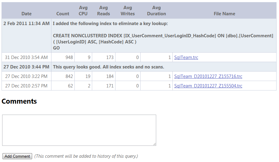 TraceTune now lets you enter a comment for a query. It can be as simple or as complex as you like. The comment will be shown inline with the execution history of that query.