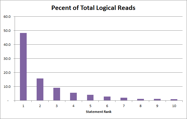 This single statement consumed 61.4% of the total logical reads on the system while we were tracing it. I also wanted to see the distribution of reads across statements. That graph looks like this: