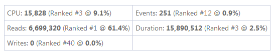 When you upload a trace, I rank each statement based on the total number of logical reads. I also calculate each statement’s percentage of the total logical reads. I do the same thing for CPU, duration and logical writes. When you view a statement you can see all the details like this: