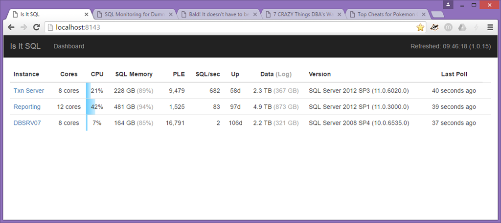 I also wanted this to be very simple to use and install. It can run as a simple command line executable. It doesn’t require .NET or Java or even SQL Server. The only requirement is some flavor of ODBC driver for SQL Server which nearly every server has. It hosts a self-contained web server that displays the information you’re looking for. It includes an option to install itself as a service so it runs in the background and is always available. Adding servers is as simple as putting their names into a text file.