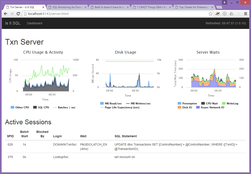 When you bring up a server page it will show the currently running queries and the last 60 minutes of the metrics above. When someone reports an issue I can look at the last hour for any server with just two clicks. And quickly answer: “Is It SQL Server?”