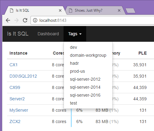 When I first starting writing this tool and using it I mostly focused on the key production servers. While testing this feature I’ve gradually added more servers to it. It’s been very helpful keeping an eye on servers I rarely look at but seem to have weird issues (cough, dev boxes, cough). Tagging allows me to filter those out of my main list but still be able to find them when I need them.